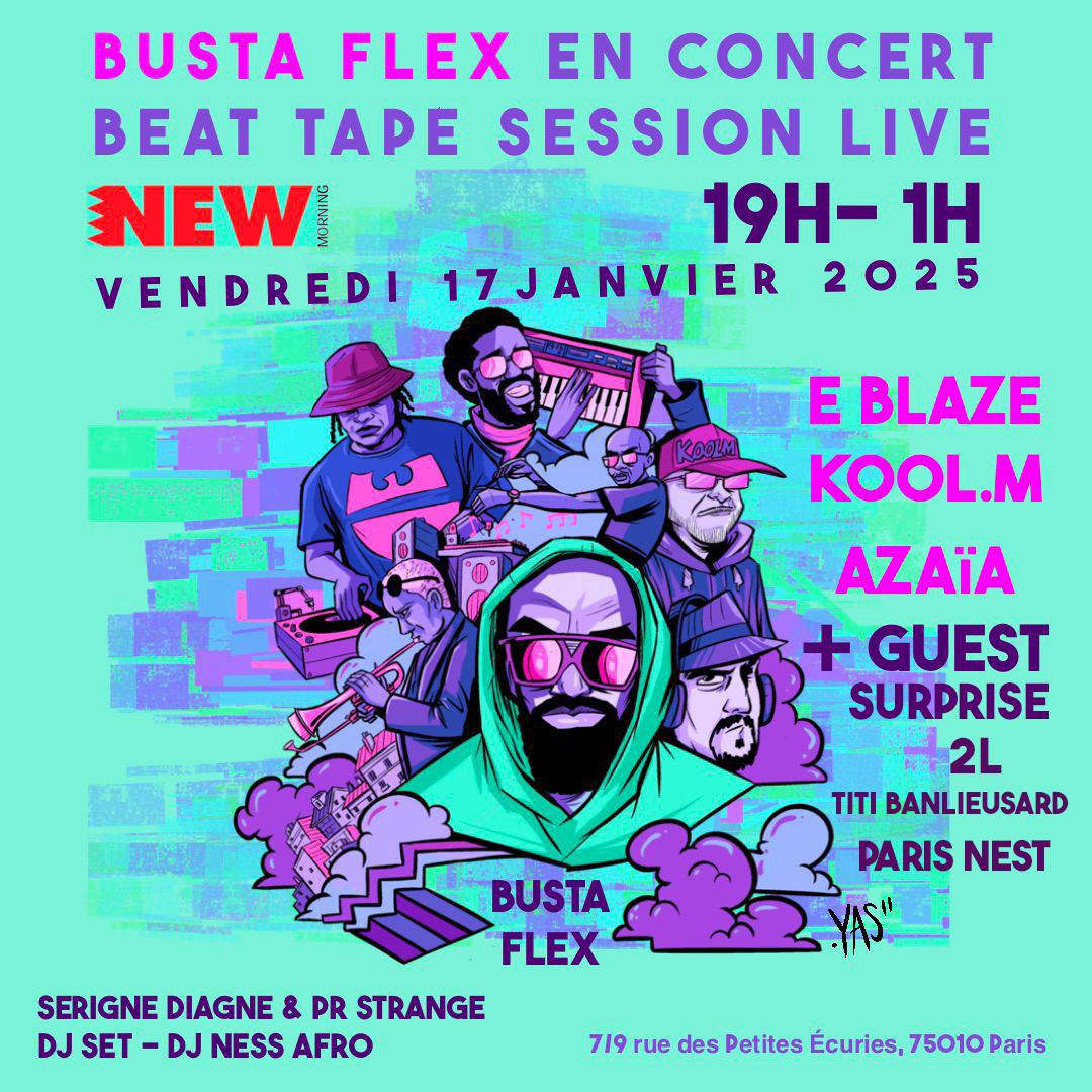 Après avoir enflammé la Scène du New Morning avec Kohndo, Kyo Itachi, E.Blaze & The Selenites Band en Septembre 2023, le New Morning et l’équipe de Beat Tape Session vous proposent une soirée axée sur le beatmaking, cette fois ci elle sera 100 % Hip Hop. La Beat Tape Session Vol.IV met à l’honneur Busta Flex ! MC Légendaire considéré comme l’un des meilleurs kickeurs et freestyleurs de l’Hexagone, il est l’une des figures de proue de l’âge d’or du rap français. Busta Flex sera en concert exceptionnel pour cette occasion.En renfort, les beatmakers E.Blaze, Kool M et Azaïa vous réservent leurs plus belles productions avec des guests de taille comme Titi Banlieusard, 2L et Paris Nest, et d’autres surprises toujours accompagnés du trompettiste Sérigne Diagne et du claviériste Cosmiqueur, avec la participation de DJ Ness Afro pour un set avec de nombreux tracks Hip Hop Français et US inédits.